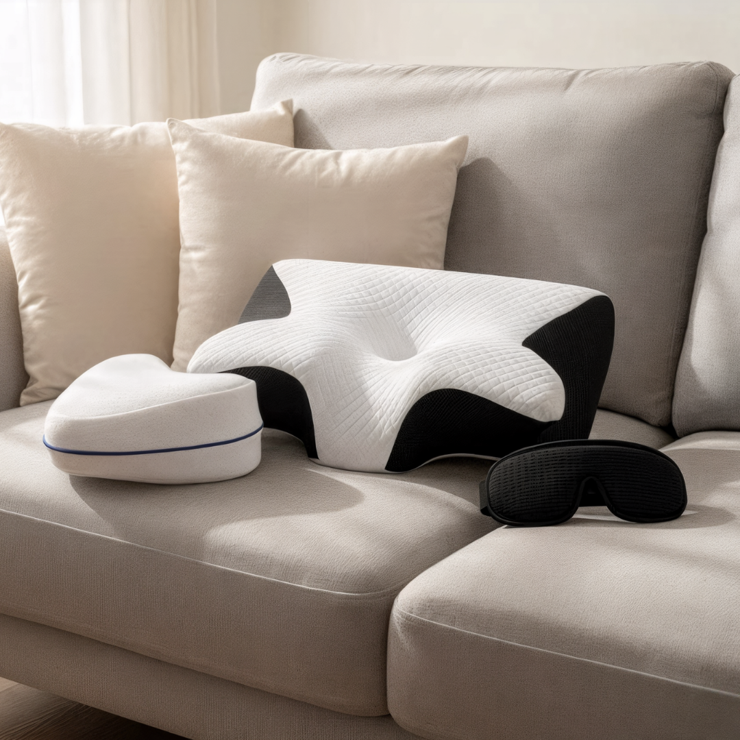 מסכת שינה תלת-ממדית – חוסמת אור לחלוטין, לא לוחצת על העיניים, עשויה מבד נושם ואיכותי שמאפשר שינה עמוקה ונינוחה.