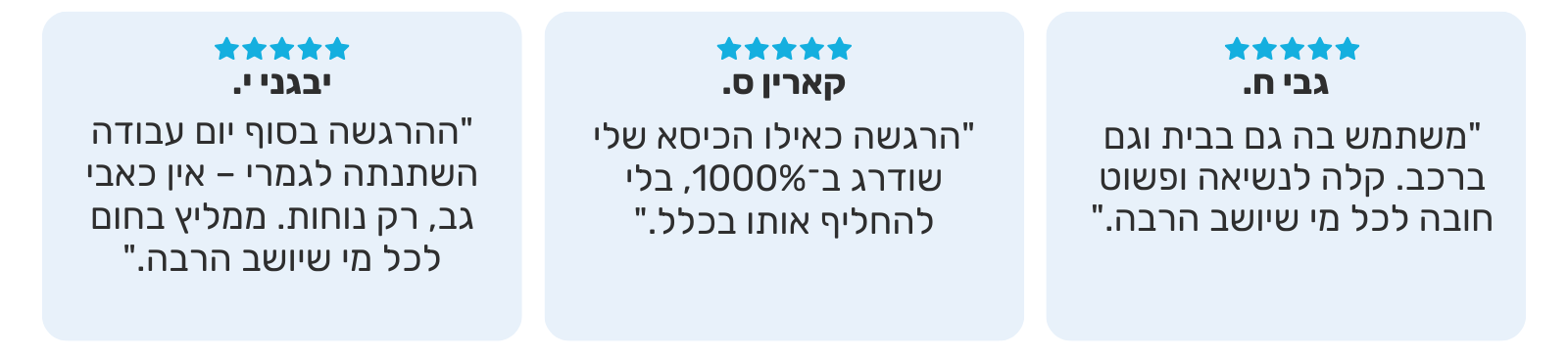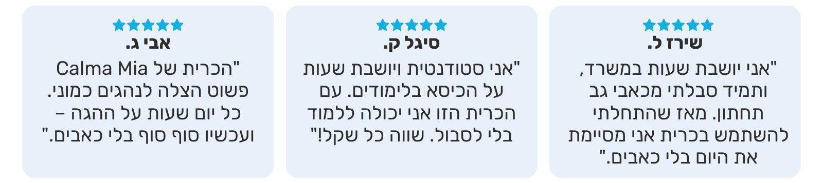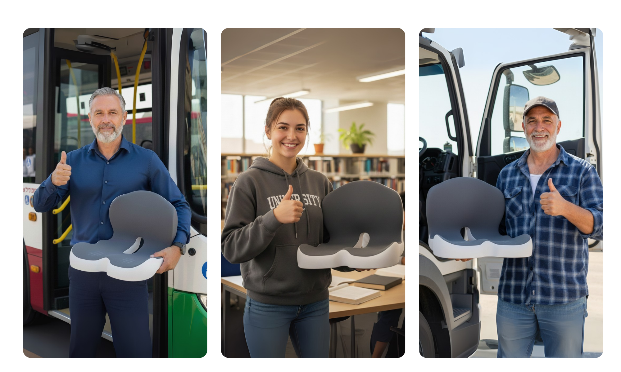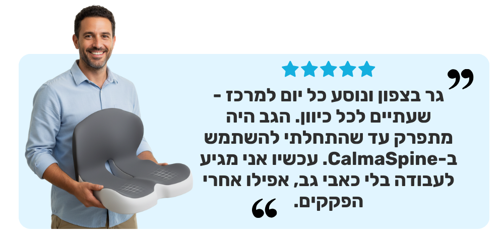 רבים מאיתנו מבלים שעות ארוכות בנהיגה או מול המחשב, וזה מתכון בטוח לכאבי גב, סיאטיקה וללחץ מצטבר באגן וברגליים. עם CalmaSpine כל זה משתנה – הכרית מפחיתה את הלחץ על עצב הסיאטיק ומביאה להקלה בכאב כבר מהישיבה הראשונה, מעניקה תמיכה מלאה לאגן ולרגליים, ושומרת על יציבה נכונה ובריאה גם בנסיעות ארוכות וגם בישיבה יומיומית. במקום לסבול מכאבים, אפשר סוף סוף לשבת בנוחות, לשמור על הבריאות ולהרגיש את ההבדל בכל יום מחדש.